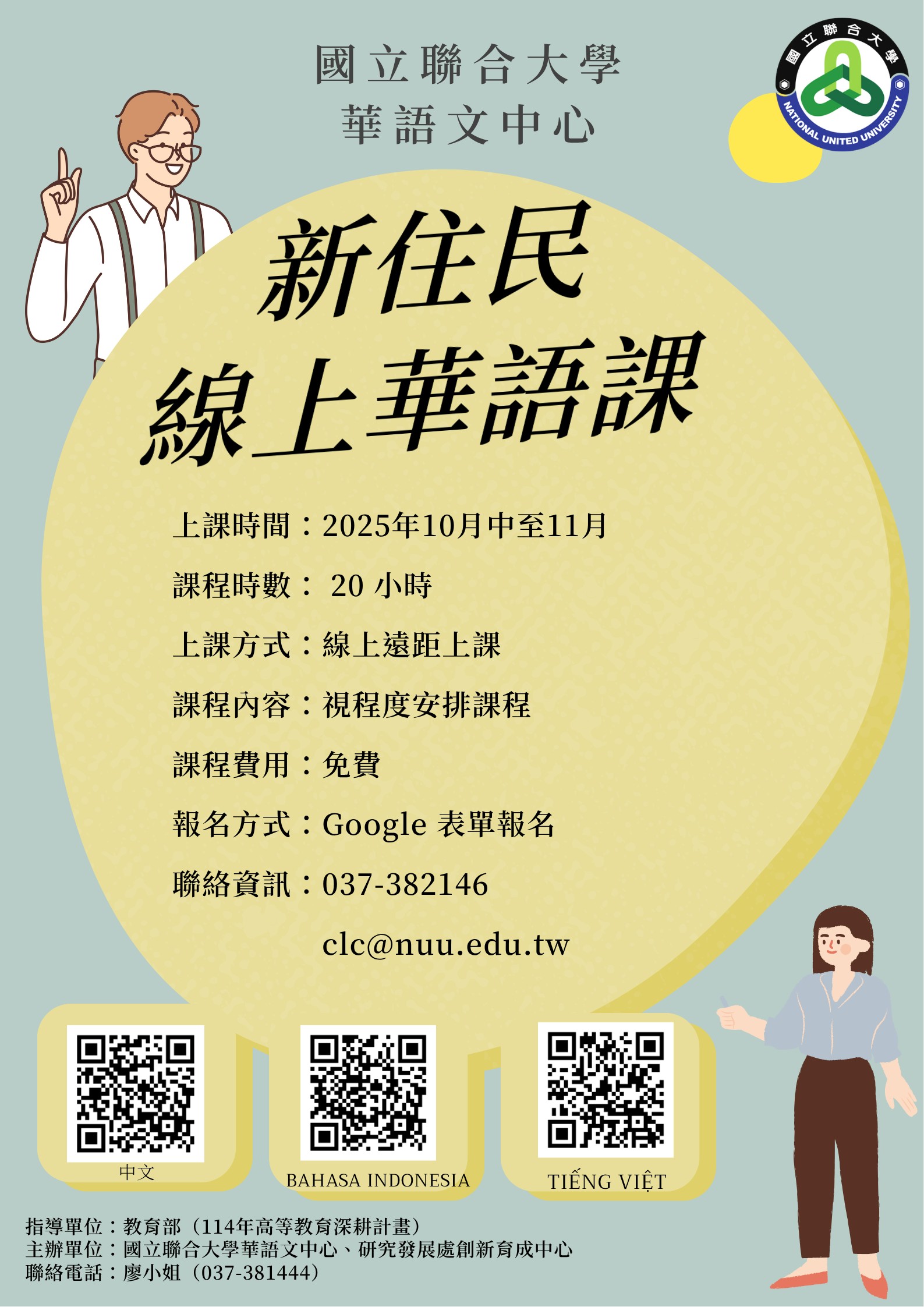 ☎️ 聯絡資訊:037-381444 / clc@nuu.edu.tw 廖小姐